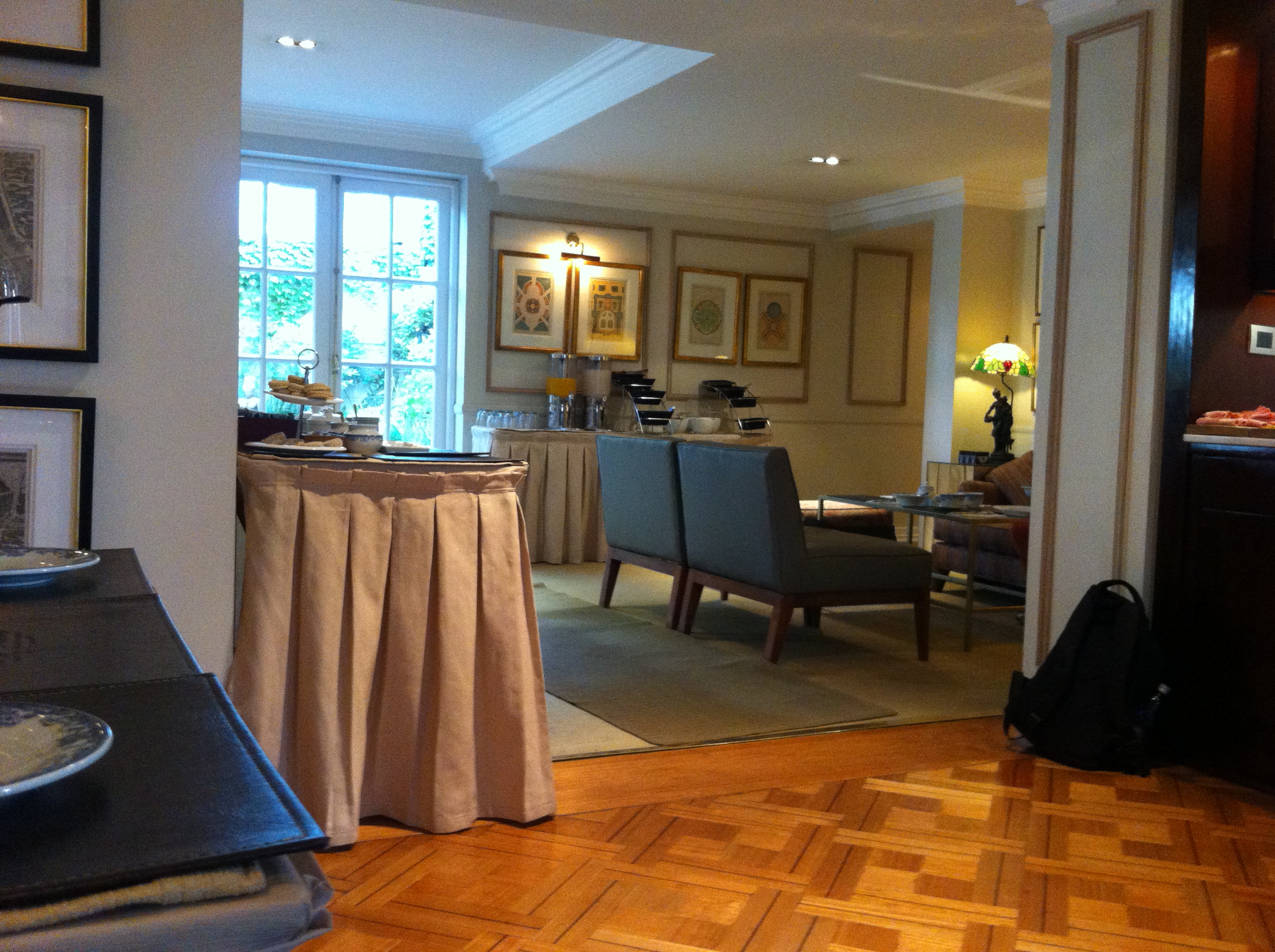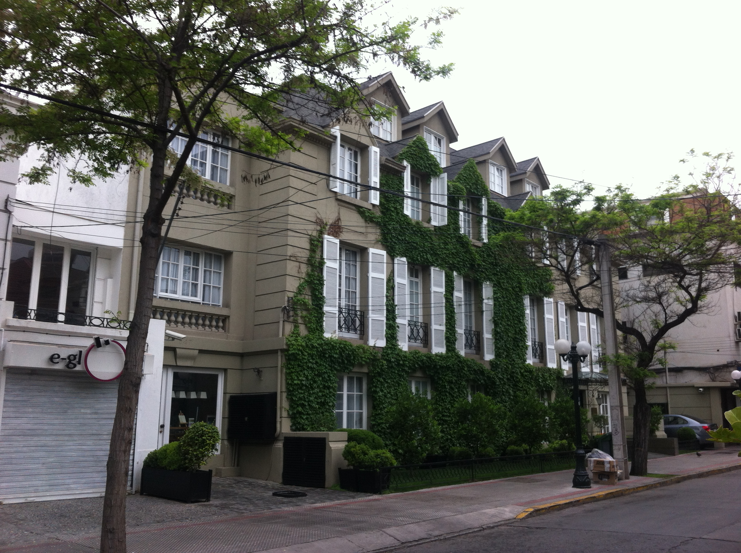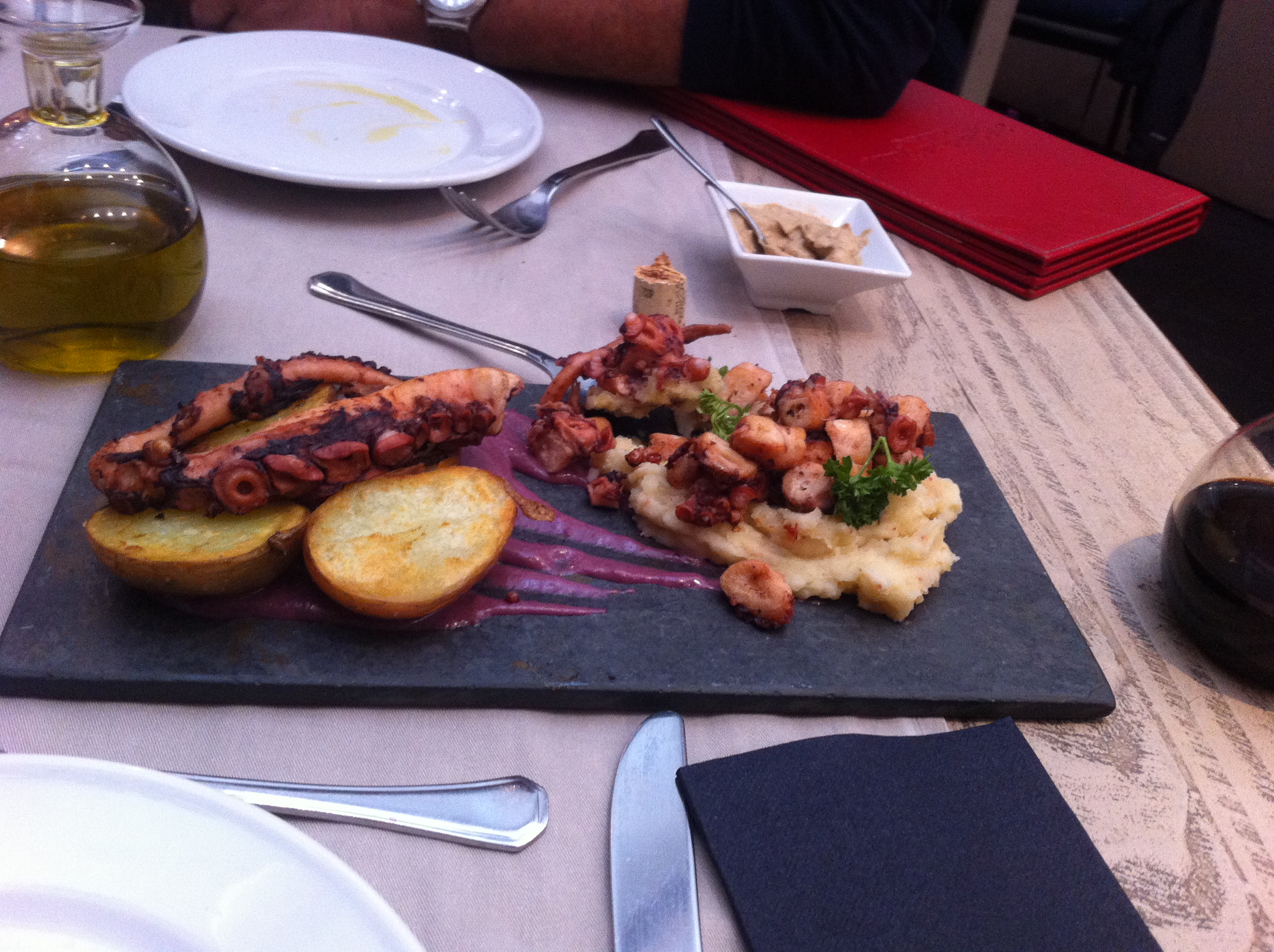 Como estávamos famintos, resolvemos experimentar o restaurante que fica bem em frente do hotel, El Jardín de Epicuro, um restaurante francês com uma área aberta (naquele dia coberta por causa do frio). Compartimos um aperitivo de polvo com batatas assadas (7.900 pesos) e outro de torradas com chistorra com ovo de codorna (3.800 pesos) ambos deliciosos e que ficaram melhores ainda com um vinho tinto chileno, é claro (vinha Santa Rita – Casa Real – 13.500 pesos).