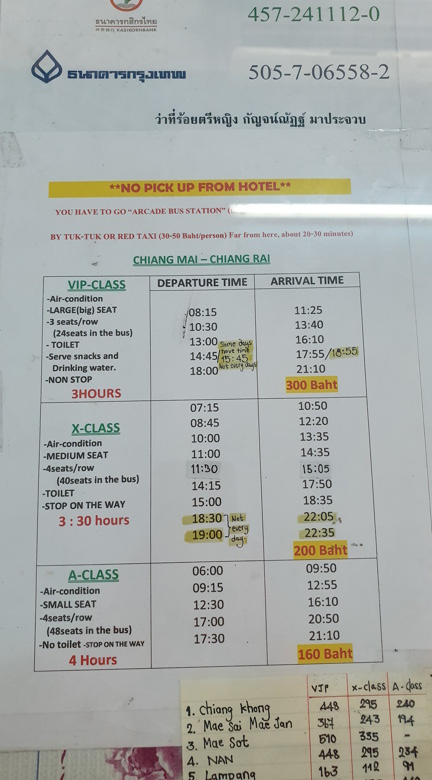 Dá para comprar as passagens numa loja da Green Bus na Cidade Antiga, em Chiang Mai. Ela fica quase em frente ao Templo Dourado (Wat Phra Singh). Você mostra o passaporte e eles imprimem os bilhetes na hora. Existem passagens a partir de 160 bath (US$ 5,06 ou R$ R$ 25,13, preços de 2020), mas a viagem é menos confortável e mais longa (dura 4 horas).